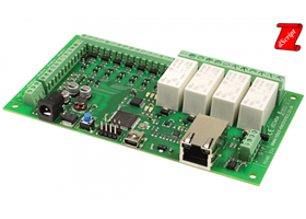 Control four 16 Amp relays and read over an ethernet connection using a web page or via simple TCP/IP based commands. This feature packed board also has 8 digital I/O, 4 analogue input connections plus 3 serial ports. The module can be programmed to respond to inputs and send/receive commands over TCP/IP. You can even customise the web page interface.