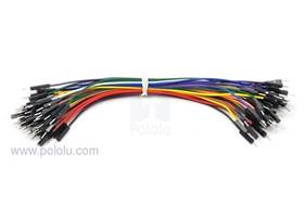 These premium jumper wires are stranded 26 awg wires with male terminations on both ends, for use with 0.1” (2.54 mm) headers and breadboards. The assortment of 12" (30 cm) wires includes five each of ten different colors.