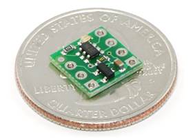 The RC switch PCB has two sets of connections, one on each side. The side with three pins can connect directly to an RC receiver or servo controller; the side with four pins has the board power supply connections and two outputs. The outputs will be at the same levels as the VCC power connection, which can range from 2.0 V to 5.5 V. The RC signal input, IN, voltage can range from 0 to 7 V, and the threshold for a logic high is approximately 1 V. The VCC pin can be connected to the RC supply, VRC, by shorting across the appropriate pads on the back side of the PCB, allowing either the RC receiver to power the digital device or allowing the digital system to power the RC receiver (if the connection between the two power pins is not made, VRC can be left disconnected since it is not used by the RC switch board).