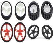 These versatile black plastic wheels have silicone tires and measure 80 mm (3.15″) in diameter. What makes them special is the included set of interchangeable collets that can be inserted into the wheel to firmly grab four different shaft types: 3mm D, 3mm round, 4mm D, and 4mm round. More Details...
