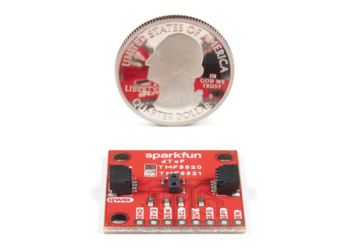 The SparkFun Qwiic dToF TMF8821 Imager is a direct time-of-flight (dToF) sensor that includes a single modular package with an associated Vertical Cavity Surface Emitting Laser (VCSEL) from AMS. The dToF device is based on Single Photon Avalanche Photodiode (SPAD), time-to-digital converter (TDC) and histogram technology to achieve a 5000mm detection range. Due to its lens on the SPAD, it supports 3x3, 4x4, and 3x6 multizone output data and a very wide, dynamically adjustable field of view. A multi-lens-array (MLA) inside the package above the VCSEL widens up the FoI (field of illumination). All processing of the raw data is performed on-chip and the TMF8821 provides distance information together with confidence values on its I2C interface. The high performance on-chip optical filter blocks most of the ambient light, and enables distance measurements in dark and sunlight environments.