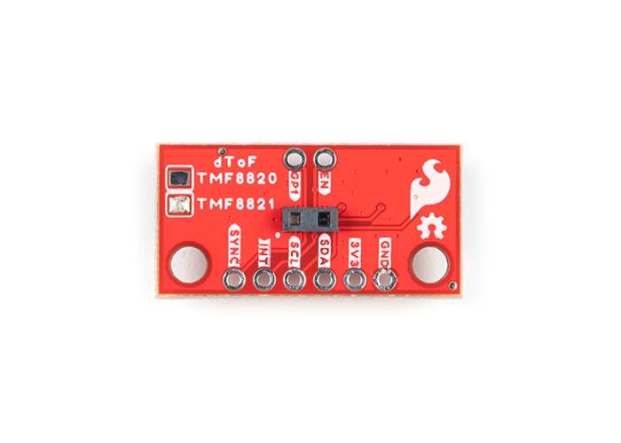 To make it even easier to get your readings, all communication is enacted exclusively via I2C, utilising our handy Qwiic system so no soldering is required to connect it to the rest of your system. However, we still have broken out 0.1”-spaced pins in case you prefer to use a breadboard. The TMF8821 offers two configurable GPIO pins and one enable (EN) pin, which are broken out as PTH pads. The board also includes a power LED and I2C pull-up resistors, each configurable via jumpers. This Mini version has a footprint that is half the size (0.5in. x 1.0in.) of our standard Qwiic Mini dToF TMF8821 Imager board. Additionally, we moved the Qwiic connectors to the back of the board. These design changes favour mounting applications where the TMF8821 sensor faces outward from an enclosure or chassis, and keeps your Qwiic cables cleanly tucked away.