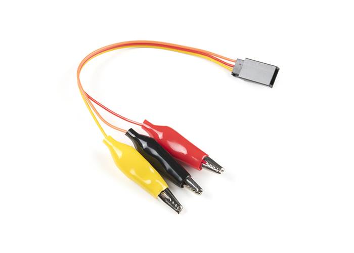 This is a servo adaptor cable that allows you to hookup your servo directly to alligator clip connections. On one end you have a shrouded male servo connector, and on the other end three 30mm shrouded alligator clips. Alligator clips are a staple item for any workbench or maker space, and with these cables you will be able to easily incorporate those clips into any project you are working on that involves a servo connection.