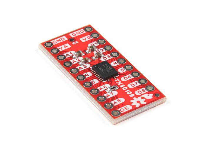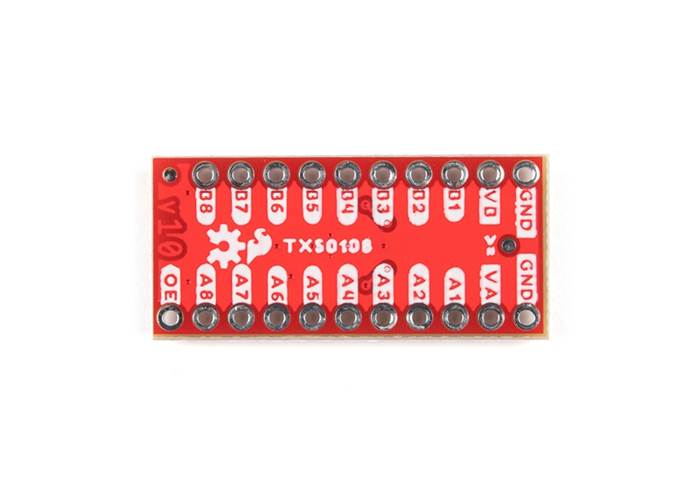 The SparkFun 8 Channel Level Shifter Breakout features the TXS0108E 8-bit, bi-directional logic level translator from Texas Instruments.