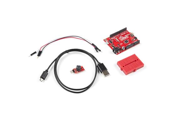 This PIR sensor offers digital output across 32 zones at 5m detection distance with 90° x 90° detection area. Additionally, the PIR in this kit already has headers soldered on making it easier to get started. This kit also includes a SparkFun RedBoard Qwiic, a mini breadboard, a 3-pack of jumper wires, and a reversible USB-A to Micro-B cable.