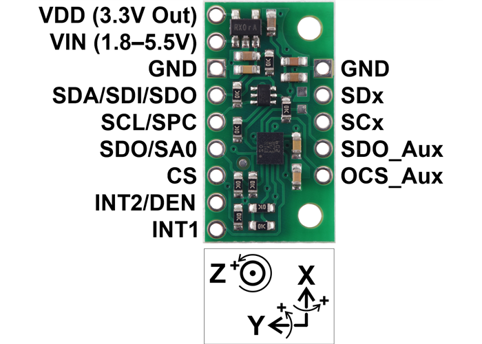This LSM6DSO carrier is pin-compatible with our earlier LSM6DS33 carrier (and many of our other ST. I²C/SPI sensor carriers), and the orientation of the sensor axes is the same. The ICs also use the same I²C address and have similar register interfaces, so code written to interface with the LSM6DS33 can probably be modified to work with an LSM6DSO without too much trouble.