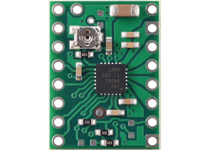 This breakout board for TI’s DRV8434S microstepping bipolar stepper motor driver operates from 4.5 V to 48 V and can deliver up to approximately 1.2 A continuous per phase without a heat sink or forced air flow (2 A peak). The SPI interface allows configuration of the current limit, step mode (11 step modes from full-step through 1/256-step), decay mode, and stall detection. The driver also features built-in protection against under-voltage, over-current, and over-temperature conditions. This version of the board uses an on-board potentiometer for setting the maximum current limit, and SPI can be used to set the actual current limit to intermediate values in increments of the set maximum/16.