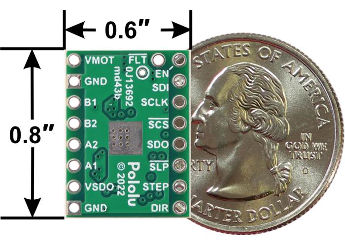 This breakout board for TI’s DRV8434S microstepping bipolar stepper motor driver operates from 4.5 V to 48 V and can deliver up to approximately 1.2 A continuous per phase without a heat sink or forced air flow (2 A peak).