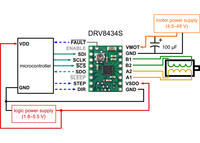 While the DRV8434S allows control of a stepper motor through a simple step and direction interface, it must first be enabled and configured through its SPI interface after each power-up. This means that the controlling microcontroller must be capable of acting as an SPI master (either with an SPI peripheral or software SPI), and it must be connected to the SDI, SCLK, and SCS pins. While the SDO and FAULT pins are not required to use this driver, it is generally a good practice to use them to monitor for error conditions.