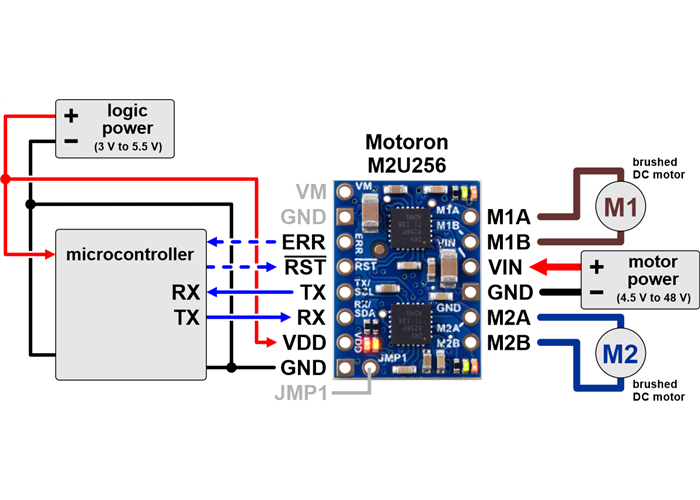 The Motoron M2T256 and M2U256 controllers make it easy to control two bidirectional, brushed DC motors using an I²C or TTL serial (UART) interface, respectively. These compact (0.6″ × 0.8″) boards operate from 4.5 V to 48 V and can deliver continuous output currents up to 1.8 A per motor. Multiple Motoron controllers can be configured to work on a single I²C or serial bus, allowing independent control of many motors. Unlike most of our motor drivers, the Motoron does not require any PWM outputs or timers on your microcontroller. Instead, only a single I²C or UART interface is needed regardless of how many Motorons you connect.