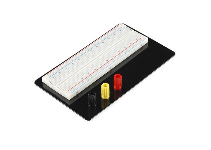 Your first exposure to electrical engineering - the bread board. Who knew it would bring so much frustration?This is your standard solderless breadboard - three binding posts two power buses black aluminium plate backing.