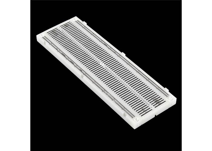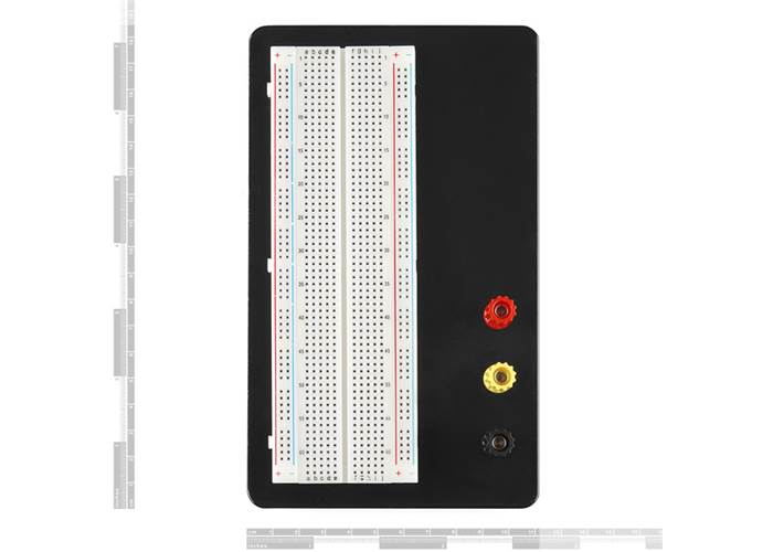 This is your standard solderless breadboard - three binding posts, two power buses, black aluminium plate backing. It works with a wide variety of wire gauges (29-20 AWG).