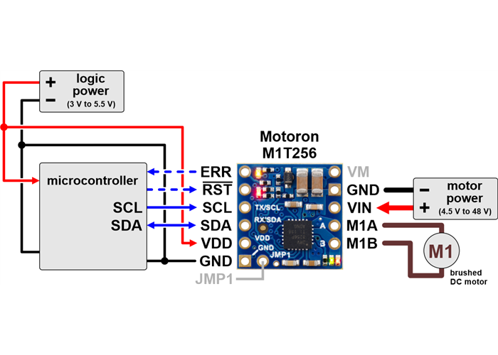 Typical wiring diagram for connecting a microcontroller to a Motoron M1T256 Single I²C Motor Controller.
