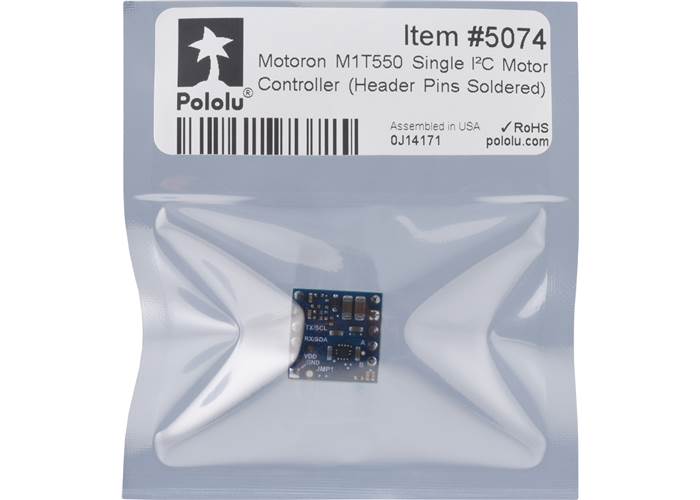 The Motoron M1T550 and M1U550 controllers make it easy to control a single bidirectional, brushed DC motor using an I²C or TTL serial (UART) interface, respectively. These compact (0.6″ × 0.6″) boards support motor supply voltages from 1.8 V to 22 V and can deliver continuous output currents up to 1.8 A. Multiple Motoron controllers can be configured to work on a single I²C or serial bus, allowing independent control of many motors. Unlike most of our motor drivers, the Motoron does not require any PWM outputs or timers on your microcontroller. Instead, only a single I²C or UART interface is needed regardless of how many Motorons you connect.