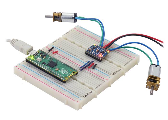 A Raspberry Pi Pico on a breadboard using a Motoron M2T550/M2U550 Dual Motor Controller to control two motors.