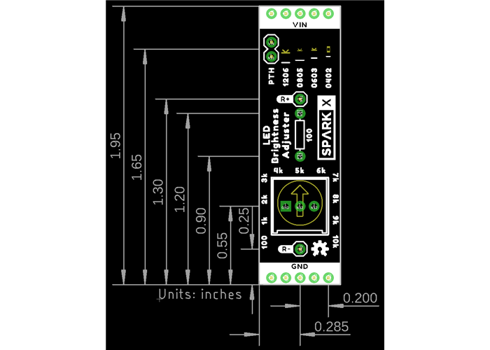 The board is designed to slot into the power rails of a breadboard, so you can stack up to 10 boards next to each other. Each board has 5 different footprints for different sizes of LEDs (SMD and through-hole), but only one LED should be added to each board. A 10k linear potentiometer is used to adjust the LED brightness, with a 100 Ohm resistor in series to protect the LED from burning out. There are silkscreen labels around the potentiometer to indicate the approximate resistance, with a couple test points "R+" and "R-" to measure the exact resistance with a DMM.