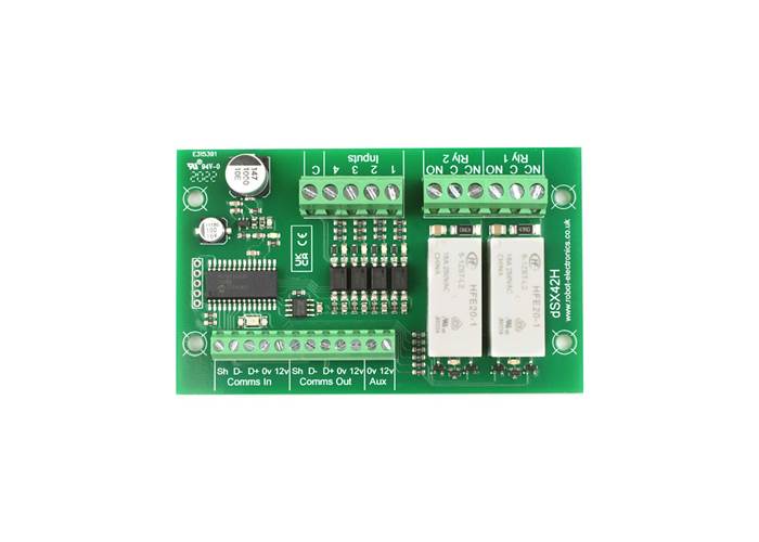 Expansion board for the dScript modules providing low voltage DC inputs (analogue or digital) and two extra relays, powered and controlled through the dS modules RS485 port.