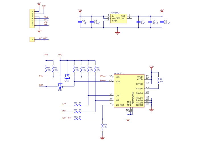 The above schematic shows the additional components the carrier board incorporates to make the VL53L7CX easier to use, including the voltage regulator that allows the board to be powered from a 2.5 V to 5.5 V supply and the level-shifter circuit that allows for I²C communication at the same logic voltage level as VIN. This schematic is also available as a downloadable PDF (103k pdf).