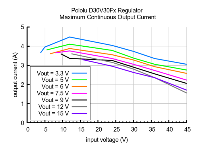 The D30V3x line of synchronous buck (step-down) voltage regulators generates lower output voltages from input voltages as high as 45 V. They are switching regulators (also called switched-mode power supplies (SMPS) or DC-to-DC converters), which makes them much more efficient than linear voltage regulators, especially when the difference between the input and output voltage is large. These regulators can typically support continuous output currents between 1 A and 4.5 A, depending on the input voltage and output voltage. In general, the available output current decreases as the input and output voltages increase.