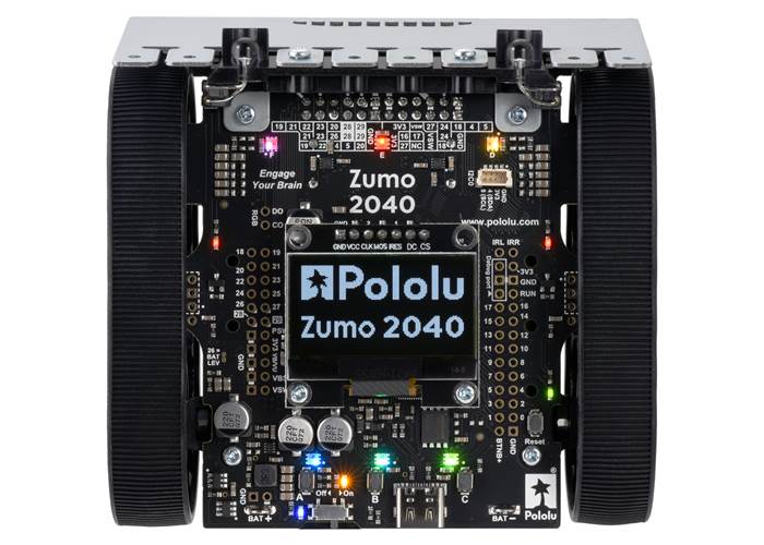The Zumo 2040 features two H-bridge motor drivers and a variety of integrated sensors, including a pair of quadrature encoders for closed-loop motor control, a complete inertial measurement unit (3-axis accelerometer, gyro, and magnetometer), five downwards-facing reflectance sensors for line-following or edge-detection, and front- and side-facing proximity sensors for obstacle detection and ranging. Three on-board pushbuttons offer a convenient interface for user input, and a 128×64 graphical OLED display, buzzer, and six RGB LEDs allow the robot to provide feedback.