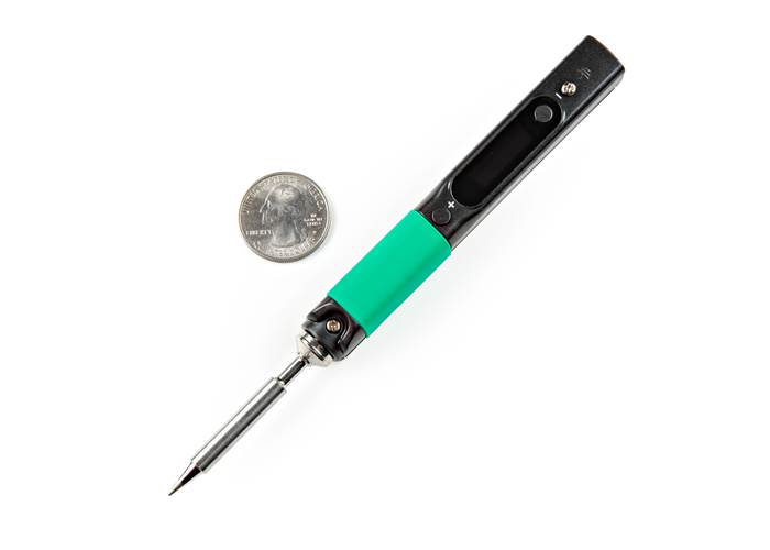 The PINECIL is capable to receive power from either the USB-C port or barrel jack. The adjustable soldering tip temperature can be set between 100° C and 400° C using the adjustment buttons around the easy-to-read OLED display.