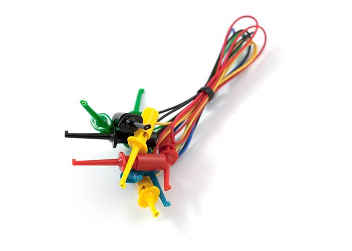 These are various leaded cables for attaching to multimeters, power supplies, oscilloscopes, function generators, etc. 5 pairs of IC Hook to IC Hook test leads. Comes with Black, Red, Blue, Green, and Yellow coloured leads.