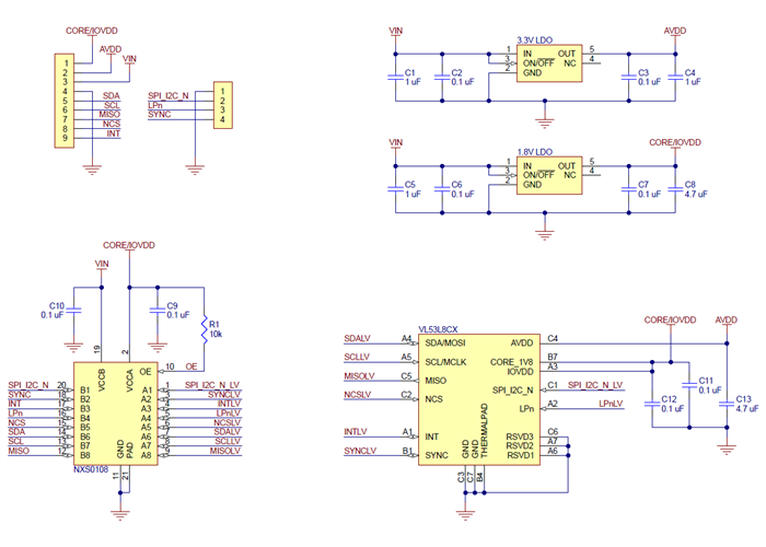 The above schematic shows the additional components the carrier board incorporates to make the VL53L8CX easier to use, including the voltage regulators that allows the board to be powered from a 3.2 V to 5.5 V supply and the level shifter circuit that allows for I²C and SPI communication at the same logic voltage level as VIN. This schematic is also available as a downloadable PDF (107k pdf).