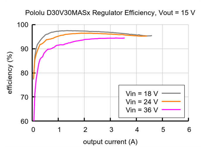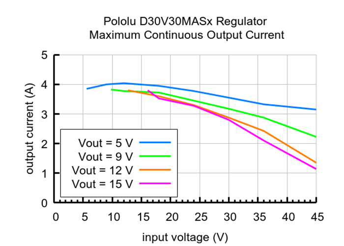 The D30V3x line of synchronous buck (step-down) voltage regulators generates lower output voltages from input voltages as high as 45 V. They are switching regulators (also called switched-mode power supplies (SMPS) or DC-to-DC converters), which makes them much more efficient than linear voltage regulators, especially when the difference between the input and output voltage is large. These regulators can typically support continuous output currents between 1 A and 4.5 A, depending on the input voltage and output voltage. In general, the available output current decreases as the input and output voltages increase.