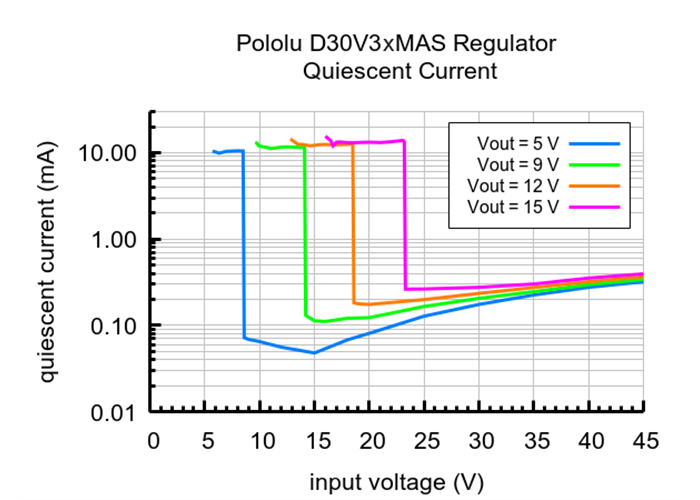 The quiescent current is the current the regulator uses just to power itself, and the graph below shows this for the different regulator versions as a function of the input voltage.