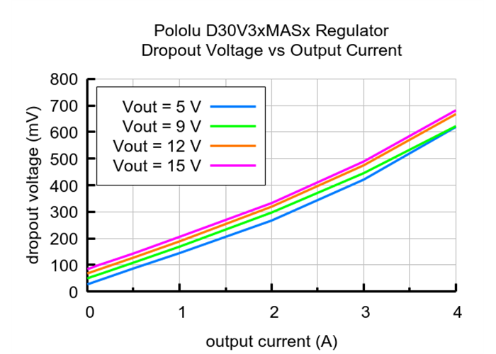 The dropout voltage of a step-down regulator is the minimum amount by which the input voltage must exceed the regulator’s target output voltage in order to ensure the target output can be achieved. For example, if a 5 V regulator has a 1 V dropout voltage, the input must be at least 6 V to ensure the output is the full 5 V. Generally speaking, the dropout voltage increases as the output current increases. The graph below shows the dropout voltages at several different output voltages as a function of output current: