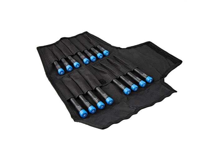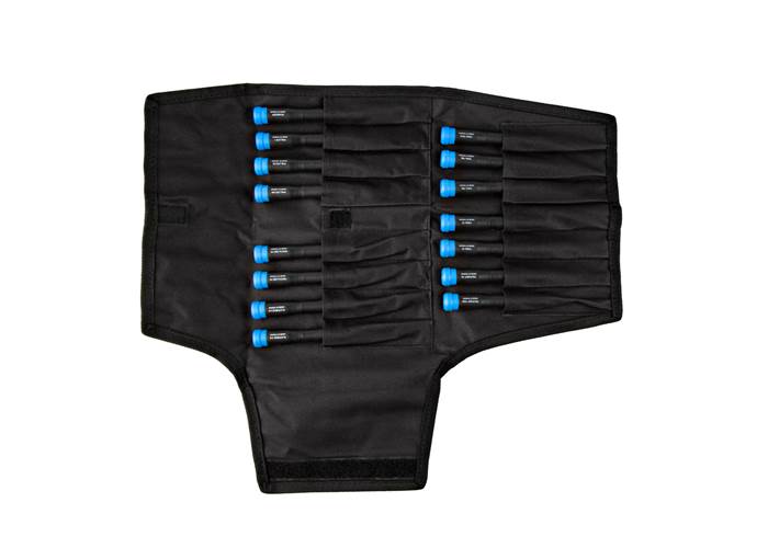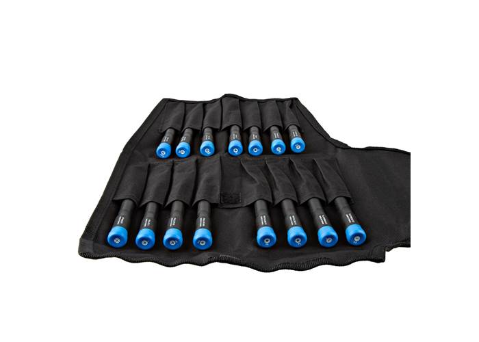The drivers are packed inside a fabric tool roll for compact and portable storage.