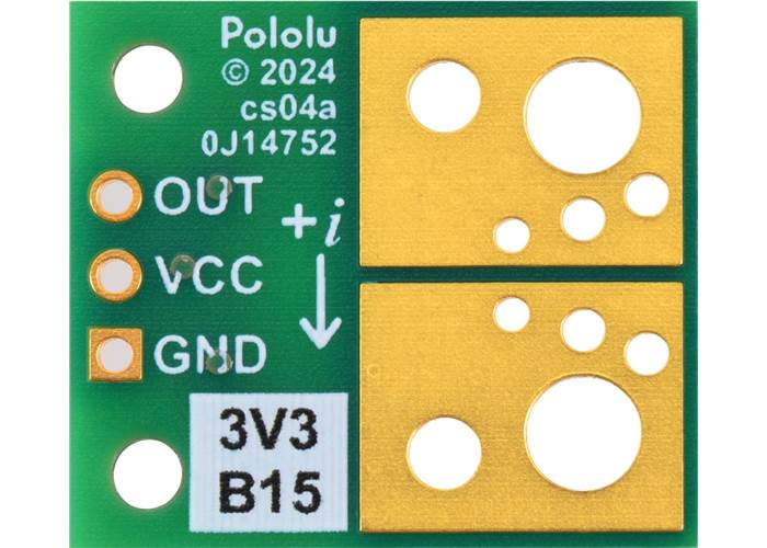 This carrier features the ACS72981KLRATR-150B3, which is intended for nominal 3.3 V operation and is designed for bidirectional input current from -50 A to +50 A. This version can be visually distinguished from the other versions by the “3V3 B05” printed on the bottom side, as shown in the left picture above.