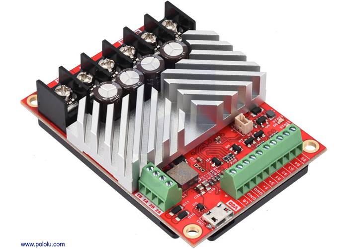 This product is the RoboClaw ST. 2x45A with screw terminals for I/O connections (a version is also available with pin header I/O connections (2x45A)). It can supply a continuous 45 A per channel (60 A peak) to a pair of DC motors and operates up to 34 V. You can find more details about this product in its datasheet.