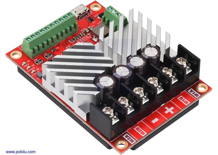 The RoboClaw motor controllers from Basicmicro can control a pair of brushed DC motors using USB serial, TTL serial, RC, or analogue inputs. Integrated dual quadrature decoders make it easy to create a closed-loop speed control system.