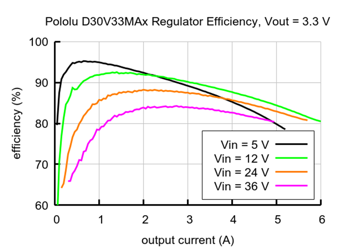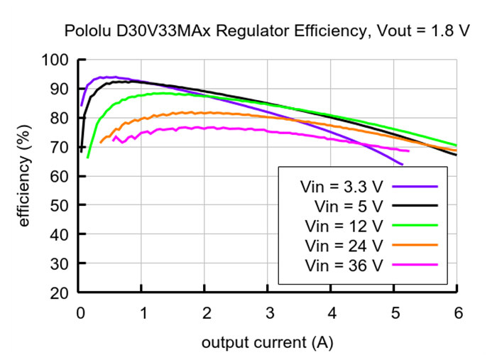 Note 1: At 30 V in and 3.3 V out. Actual achievable continuous output current is a function of input and output voltages and is limited by thermal dissipation. See the output current graph on the product page for more information.