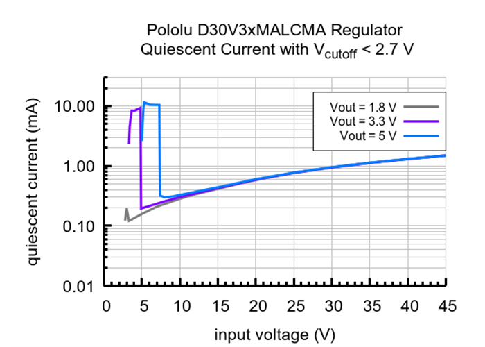 The quiescent current is the current the regulator uses just to power itself, and the graph below shows this for the different regulator versions as a function of the input voltage. The data in the graph shows the quiescent current with the low-voltage cutoff set to its minimum value of 2.7 V; in general, the quiescent (and shutdown) currents are reduced by increasing the cutoff voltage threshold.