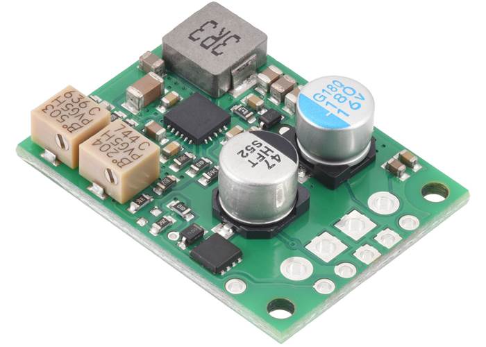 The D30V3x line of synchronous buck (step-down) voltage regulators generates lower output voltages from input voltages as high as 45 V. They are switching regulators (also called switched-mode power supplies (SMPS) or DC-to-DC converters), which makes them much more efficient than linear voltage regulators, especially when the difference between the input and output voltage is large. These regulators can typically support continuous output currents between 1 A and 4.5 A, depending on the input voltage and output voltage. In general, the available output current decreases as the input and output voltages increase.