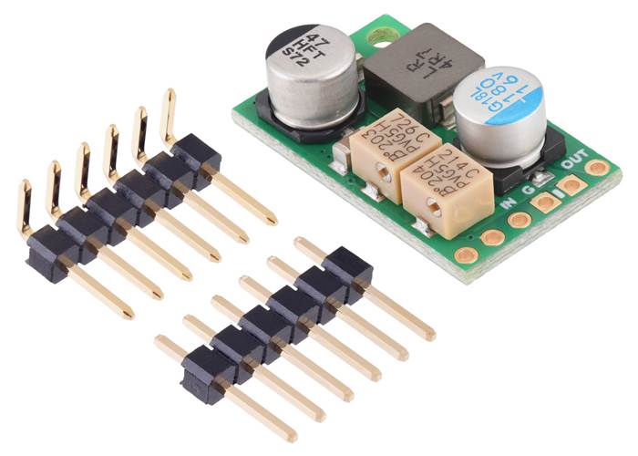 The six connection through-holes are arranged on a 0.1″ grid for compatibility with solderless breadboards, connectors, and other prototyping arrangements that use a 0.1″ grid. A 6×1 straight male header strip and a 6×1 right-angle male header strip are included with the regulator.