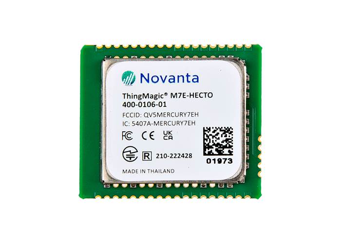 The M7E Hecto features the Impinj Ex10 RAIN RFID reader chip. The modules have very low power consumption and are ideal for battery-operated, low cost, small form-factor portable readers. Their wide RF output range is critical in supporting read/write requirements for RFID-enabled printers and tag commissioning stations.