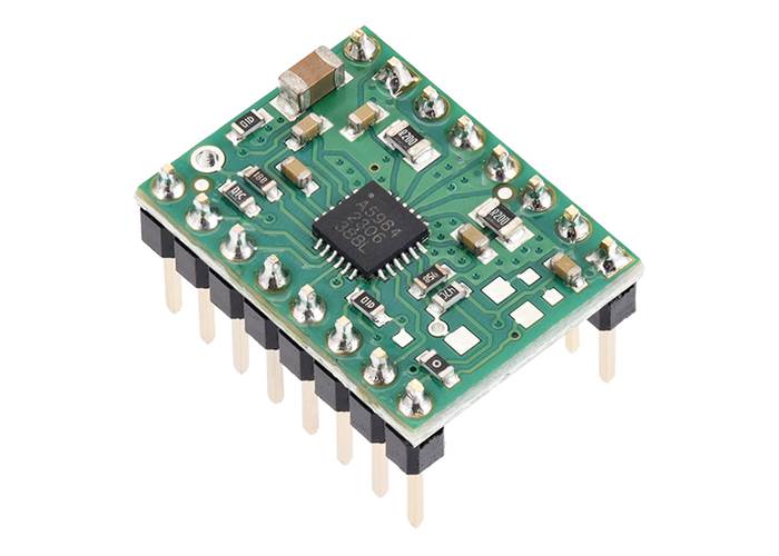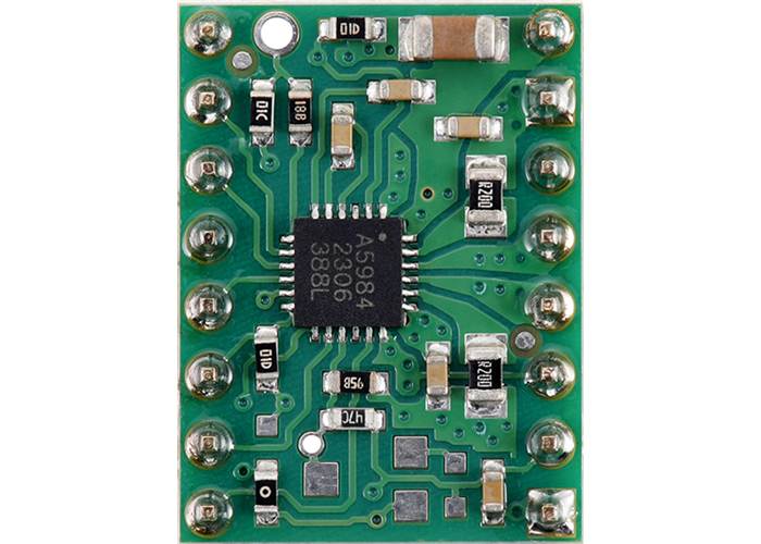 This product is the A5984 carrier with a fixed current limit of 750 mA (VDD = 5 V) or 500 mA (VDD = 3.3 V). This version has soldered headers as shown in the pictures above, so no soldering is required to use it with an appropriate 16-pin socket or solderless breadboard. See the item #5348: A5984 Stepper Motor Driver Carrier, Fixed 750mA@5V / 500mA@3.3V, Blue Edition product page for more information about this driver.