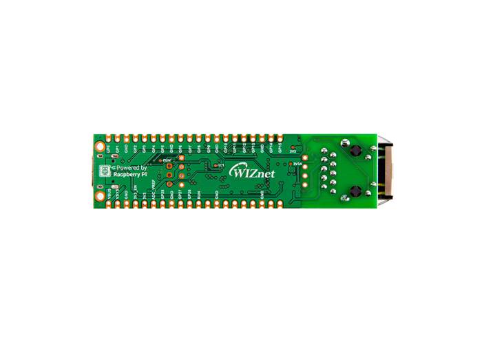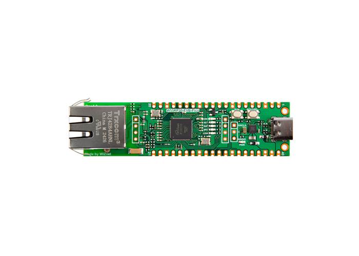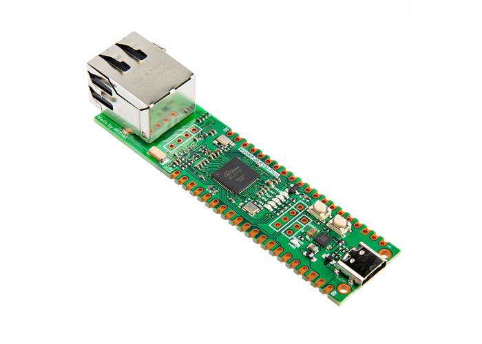 The W55RP20-EVB-Pico is an evaluation board for W55RP20, a chip that combines W5500, a wired TCP/IP controller, and RP2040 – and basically works the same as Raspberry Pi Pico board but with additional Ethernet via W5500.