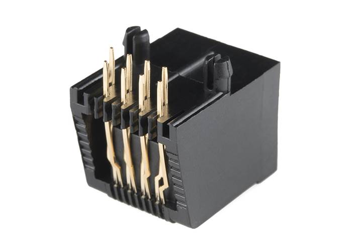 These are simple through-hole RJ45 sockets with PCB mounting posts. These 8-pin connectors are commonly used in conjunction with Cat5, Cat5e, and Cat6 Ethernet cables. Because Ethernet cable is so ubiquitous, these are awesome for projects where you need to string a lot of modules together over a distance.