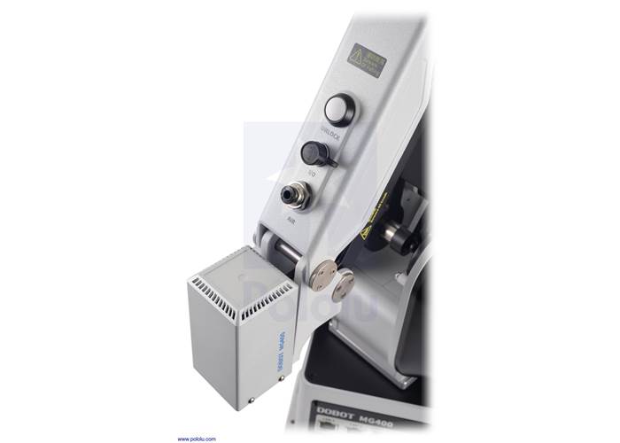 The Dobot MG400 is a departure from products typically available from Pololu. While the 8 kg (17 lb) unit is small for the collaborative robot world, it is much larger than typical Pololu products, and the cost is correspondingly higher as well. However, the price is still very competitive for what the robot arm offers, as the high ±0.05mm positional repeatability make this cobot a compelling option for serious automation applications. With a footprint of 19 cm (7.5 in) square, the low cost and small size also make the Dobot MG400 accessible for education and research applications with lower budgets that require more than the toy or hobby level of products typically available at lower costs.