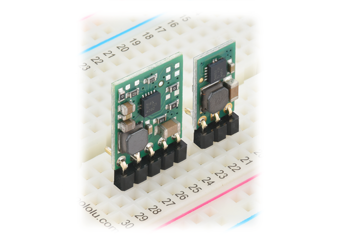 D45V1ExFx step-down voltage regulators, soldered with straight header pins(not included), on a breadboard.