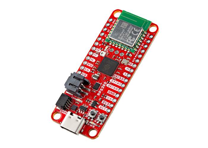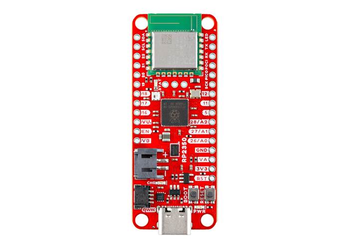 The SparkFun RP2350 Thing Plus is a powerful wireless IoT board featuring the selectable-core RP2350, WiFi 4, Bluetooth 5.2, LiPo battery charging, and a Qwiic connector.
