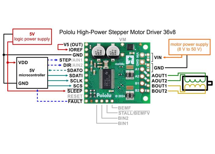 Typical wiring diagram for connecting a microcontroller to a Pololu High-Power Stepper Motor Driver 36v8.