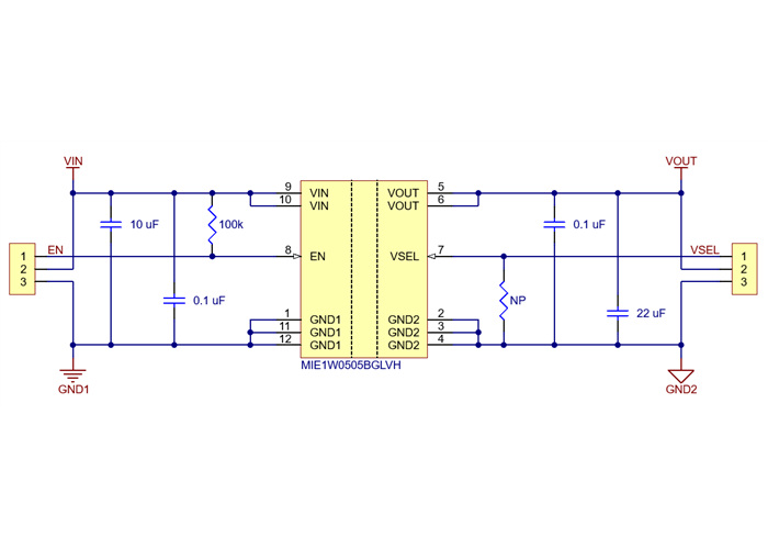 This power module is based on the MPS MIE1W0505BGLVH and provides regulated, galvanically isolated DC-to-DC power. The output voltage is set to 5 V by default and can be changed to 3.3 V through a selection pin.