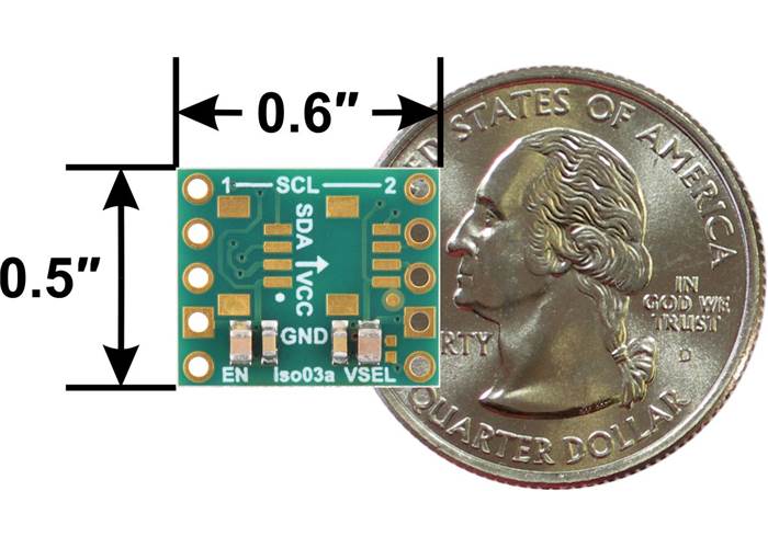 Pololu I²C Isolator with Isolated Power, ISO1640, MIE1W0505BGLVH, with dimensions and a US quarter for size reference (version without connectors shown).