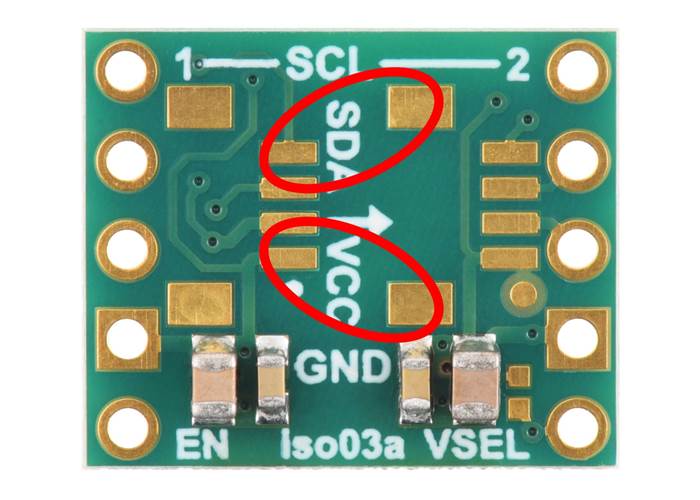 Although the ISO1640 IC has an isolation rating of up to 3 kVRMS and the MIE1W0505BGLVH IC has an isolation rating up to 2.5 kVRMS, please note that the board is made to be compact, and the tightest clearance (2 mm) is smaller than clearances of the IC packages (4mm for the ISO1640 and 3.5 mm for the MIE1W0505BGLVH). The picture below shows the regions of tightest clearance (the larger pads are just structural pads for the connectors and are not electrically connected to anything):