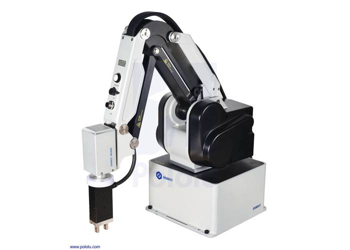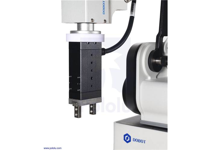 These grippers are available in two different sizes and each size is available with or without an RS-485 interface (see comparison table below). They fit small collaborative robots (cobots) such as the Dobot MG400, and operate at 24 VDC, which can be supplied from the MG400. The simple PNP-type PLC interface can connect directly to the MG400 I/O ports. A simple 3D-printed adaptor (139k STEP) can be used to mount a gripper to the MG400 arm.
